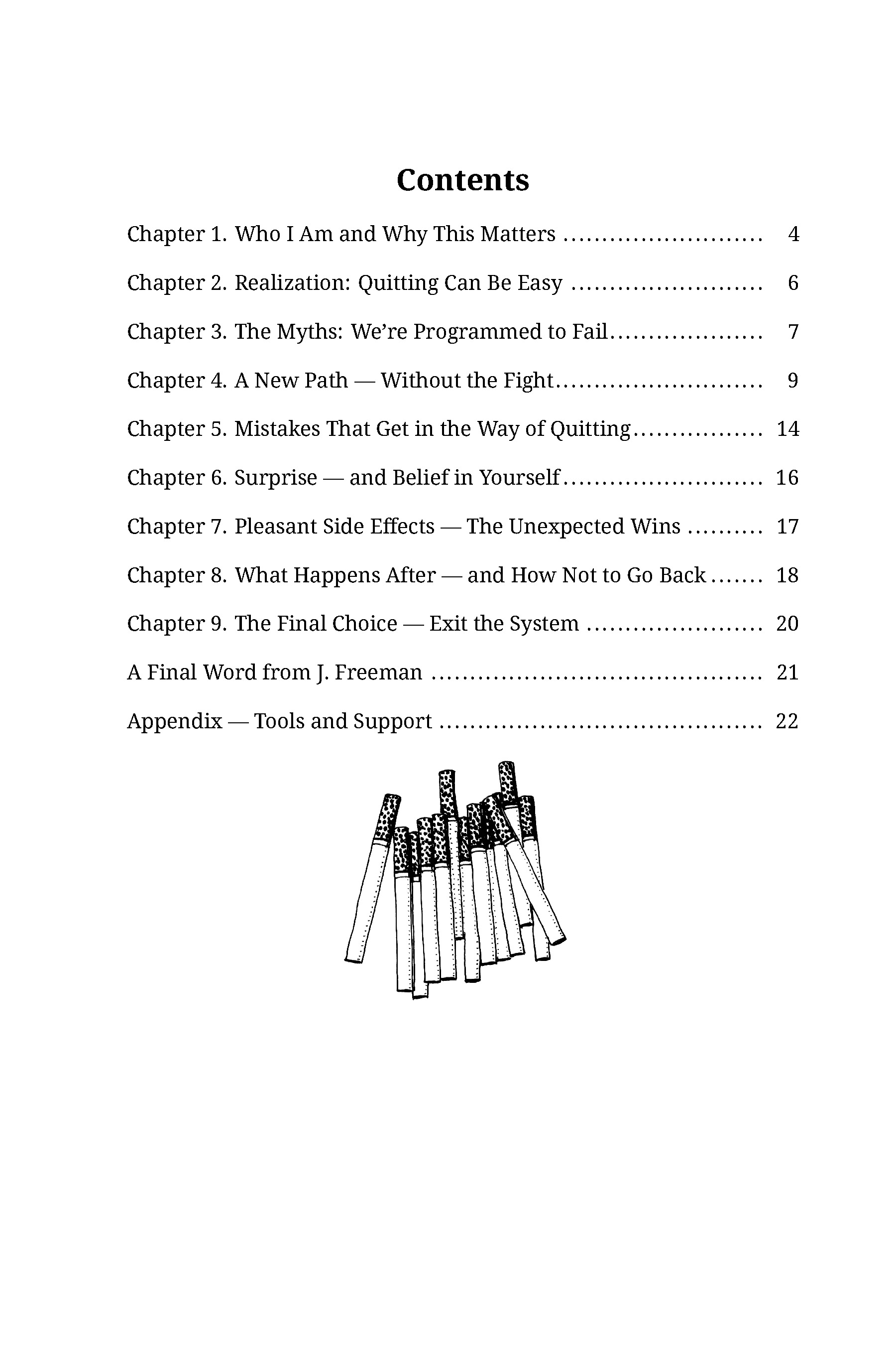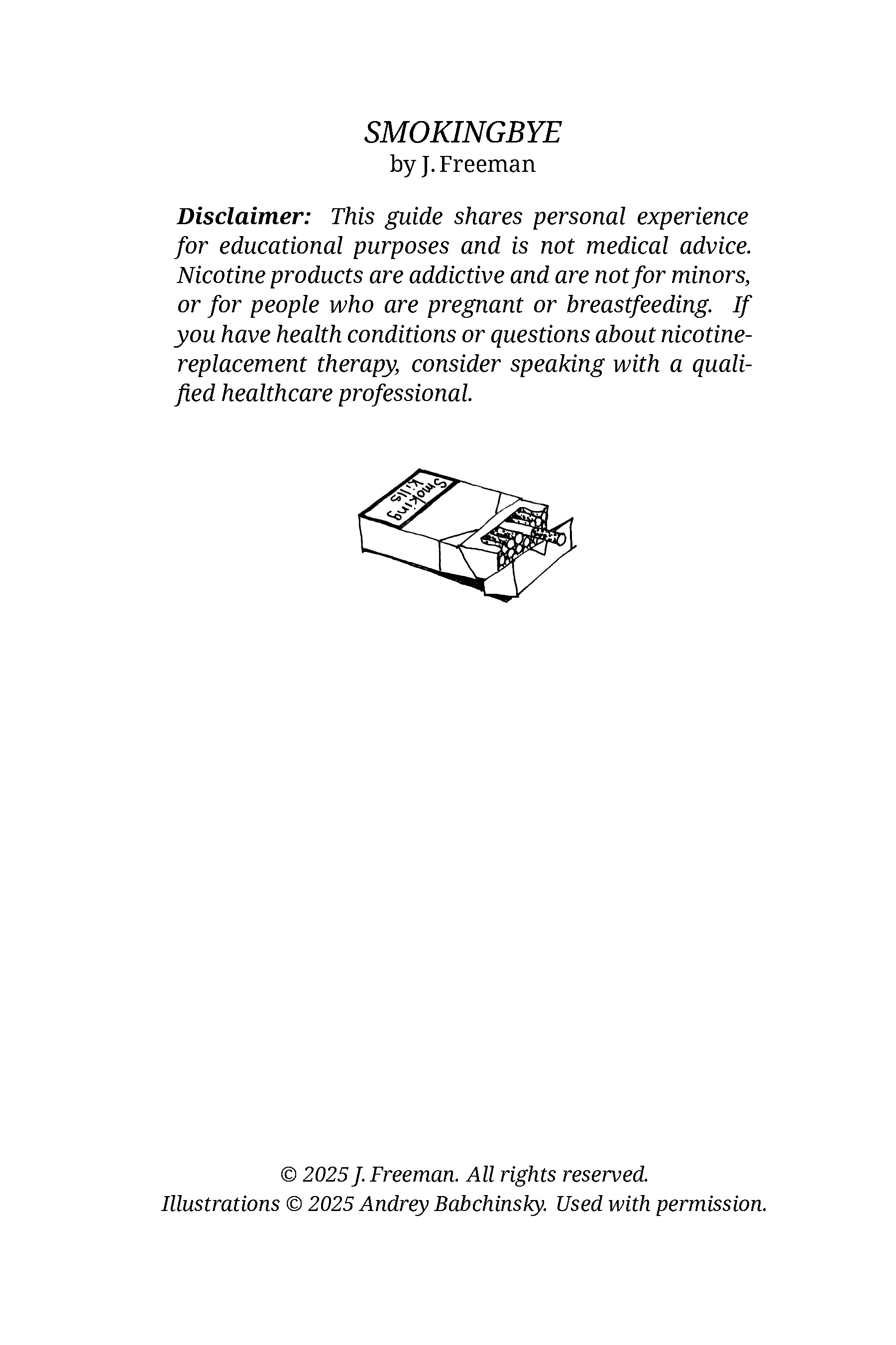 SmokingBye is a short, structured PDF guide for adult smokers and nicotine users who want to quit without stress, pressure, or heroic willpower — using a calm, gradual reduction approach (not “cold turkey”).